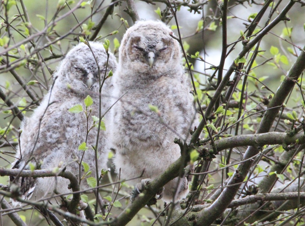Further surprises awaited just off the path. Always looking around me I noticed two woolly shapes in amongst branches of a bush to my left. I zoomed in on the shapes with my camera and was thrilled to see the shapes transform into two sleepy downy owlets! I’d never ever seen owlets before. One of them seemed to be watching me and following my slow motion movements.