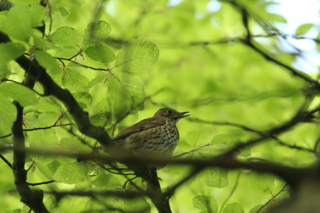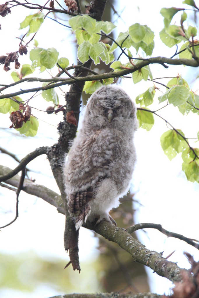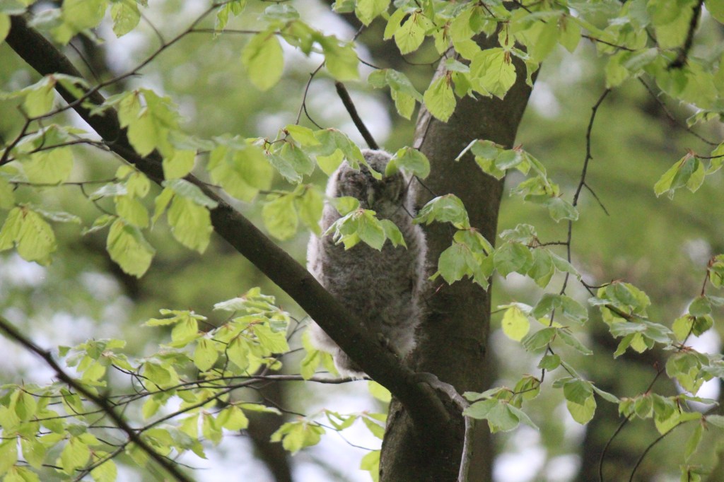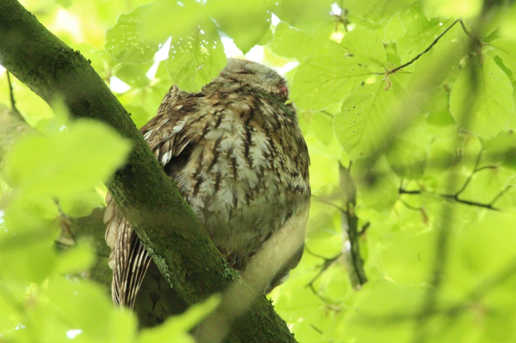 Today I returned to the wood in the quiet of early morning. At first no sign of parent or owlet. But then I saw the parent perched on a branch next to the path I was walking on. It was looking at me and II knew if I tried to lift my camera for a shot it would fly off so I just enjoyed gazing at it. Then it did fly off, first to one tree where smaller birds were mobbing it, then it zigzagged back and up into a larger tree. The birds around went nuts, making loud alarm and flying as close as they dared to the owl. The owl tucked its head right in and held fast. After five minutes it was left in peace. It needs its sleep during the day after hunting all night and with one or two owlets to feed.