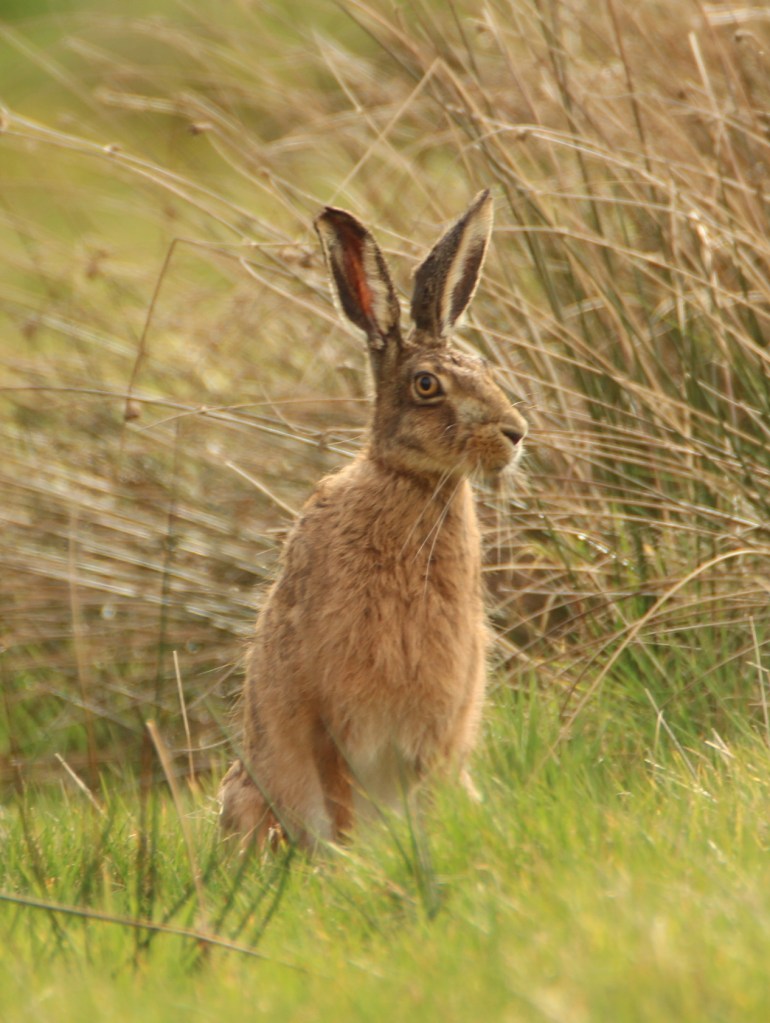Hares are nocturnal creatures and can only usually be seen at dawn or dusk. Often they hide in long grassy hollows during the day, keeping as low down as possible and with their long ears pinned back. Many’s the time I’ve zoomed in on a boulder or a pile of dung thinking it might be a hare in a field!