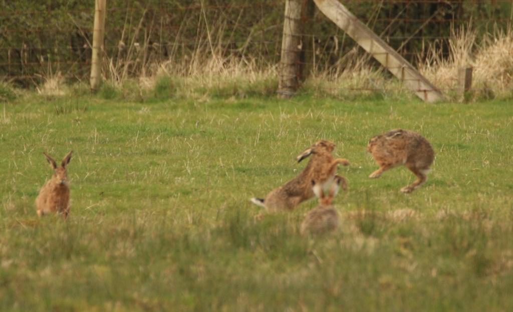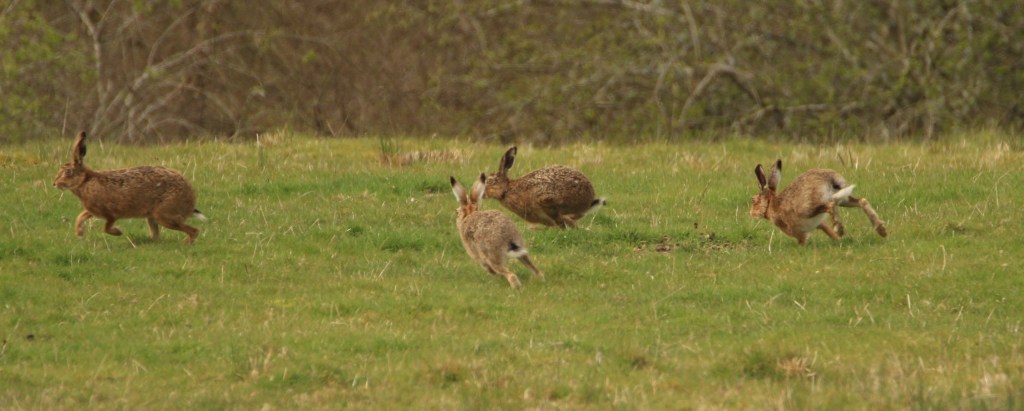 But in Spring time look out for the “Mad March Hares”. I saw them in April this year, very active and looking for or fending off mates. I’d seen a pair boxing before but never managed to snap them at it. Then this year I got very lucky and watched four of them chase each other madly round the bottom of a field before starting a boxing session.