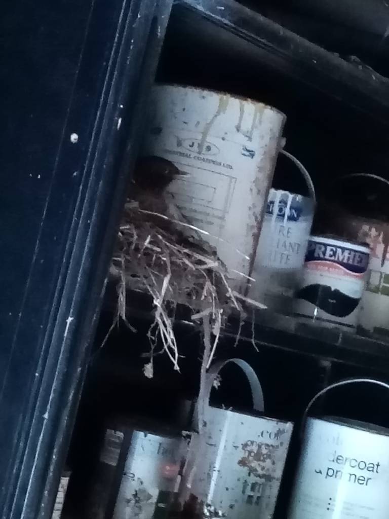 Our blackbird nest in our hedge was attacked by a magpie last Saturday. I could hear the alarm calls of Ma and Pa Blackie, sounding like scissors opening and closing. They were flying frantically around the hedge. Then I noticed a magpie making its way along the inside of the hedge. Sadly the nest has now been abandoned, eggs or chicks eaten by the magpie. However my friend Helen sent me this picture of a blackbird nesting among the paintpots in an old shed! Hopefully it will be more out of sight of magpies there.