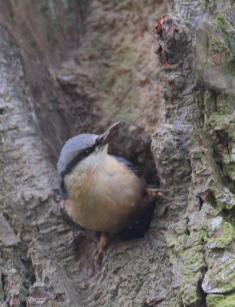 Nuthatches nest in holes in trees. Here is one preparing its nest.