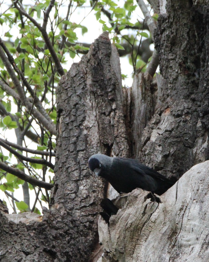Here is a pair of jackdaws preparing their nest in an old tree hollow. The jackdaws in my street try to nest under house roofs, having successfully managed it in an abandoned property. We could hear them hammering away at a rotting wood eave on our house and had to get the hole patched up before they made it any bigger.