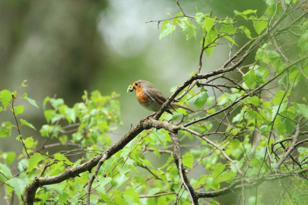 While I’ve been sitting at the base of a tree watching “Woody” I’ve also been seeing this robin collecting juicy caterpillars. It seems to have a nest hidden in thick undergrowth.