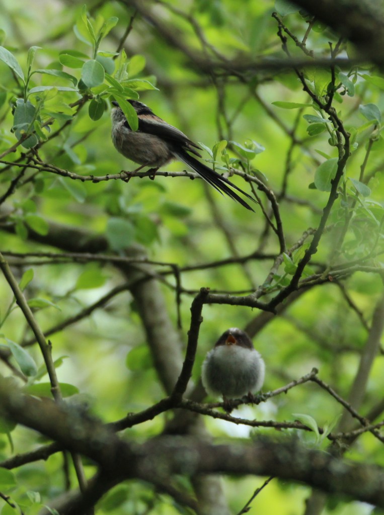 The very sociable long tailed tits were whistling to each other and having quite a feeding frenzy in the trees on the edge of the wood. The wee ping-pong ball shaped fledglings were making the parents work hard to feed them. They are delightful wee birds!