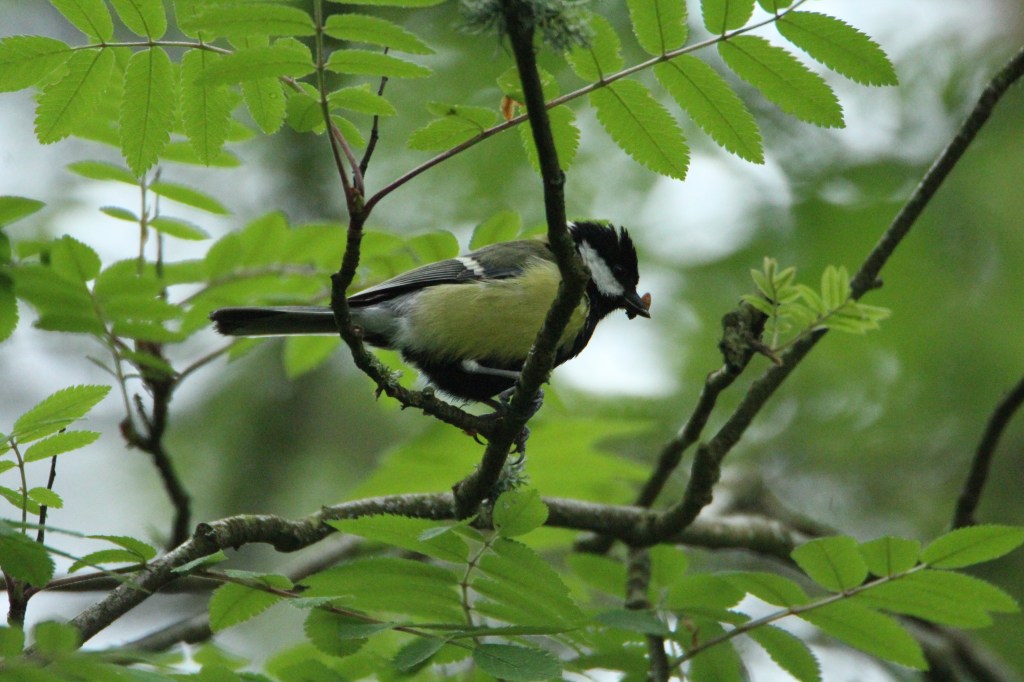 This great tit was collecting food for its youngster who was chirping out for it from a hidden branch in a neighbouring tree.