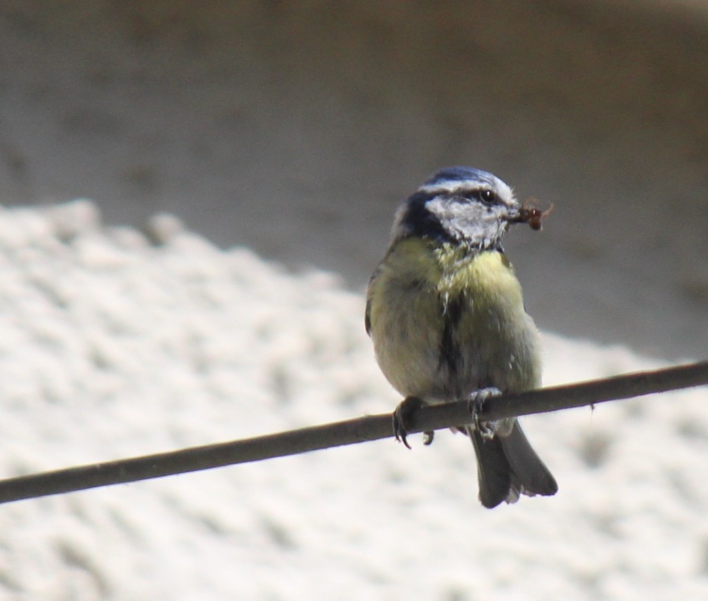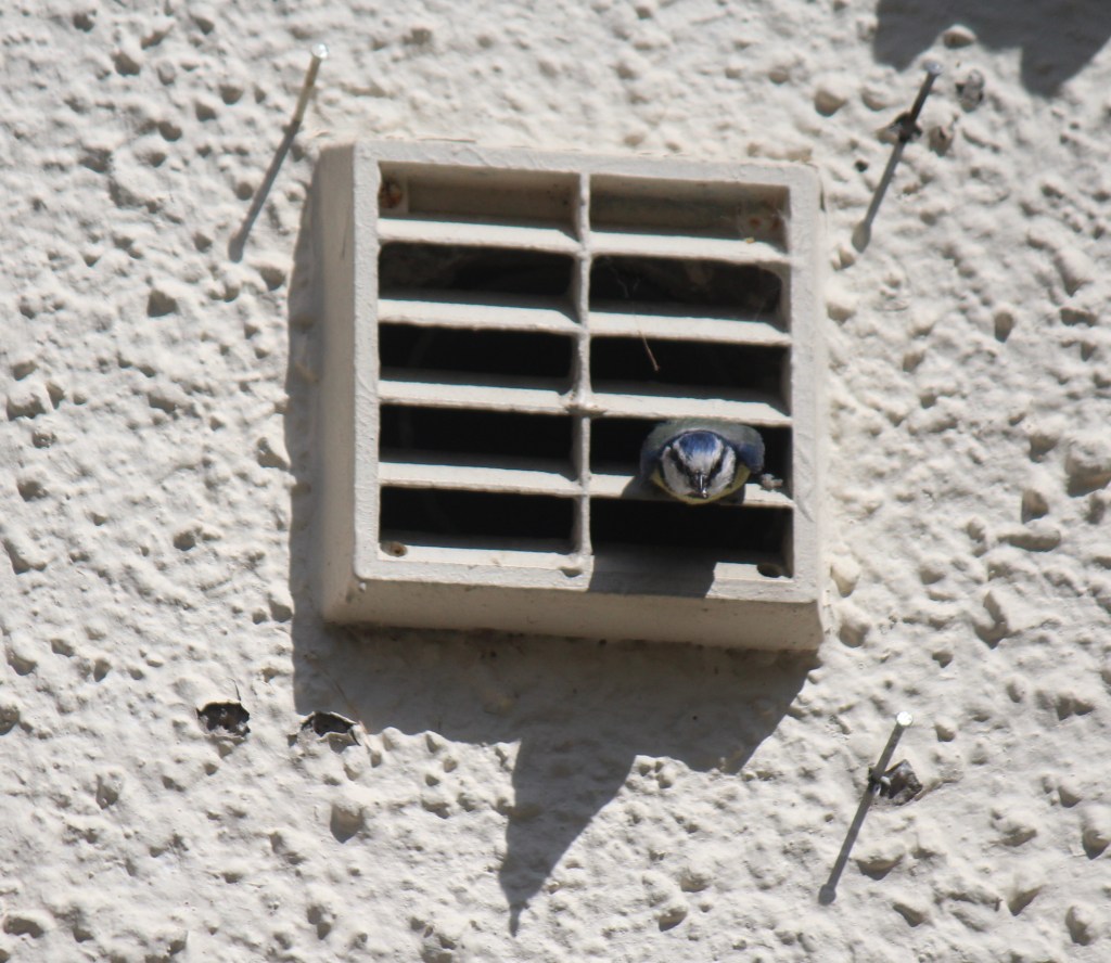 I was wildlife watching from my dad’s back garden today. There a pair of cheeky blue tits have set up home in an old vent on the side of the house. It used to be the vent for the larder, which helped keep food cool on a stone slab before a fridge did the job. Dad tried putting netting over the vent to keep them out but they chewed their way through it. In the end he gave up and let nature takes its course. We can’t hear the chicks inside, I’m guessing because they are quite far back. Both parents are definitely busy feeding a brood though.