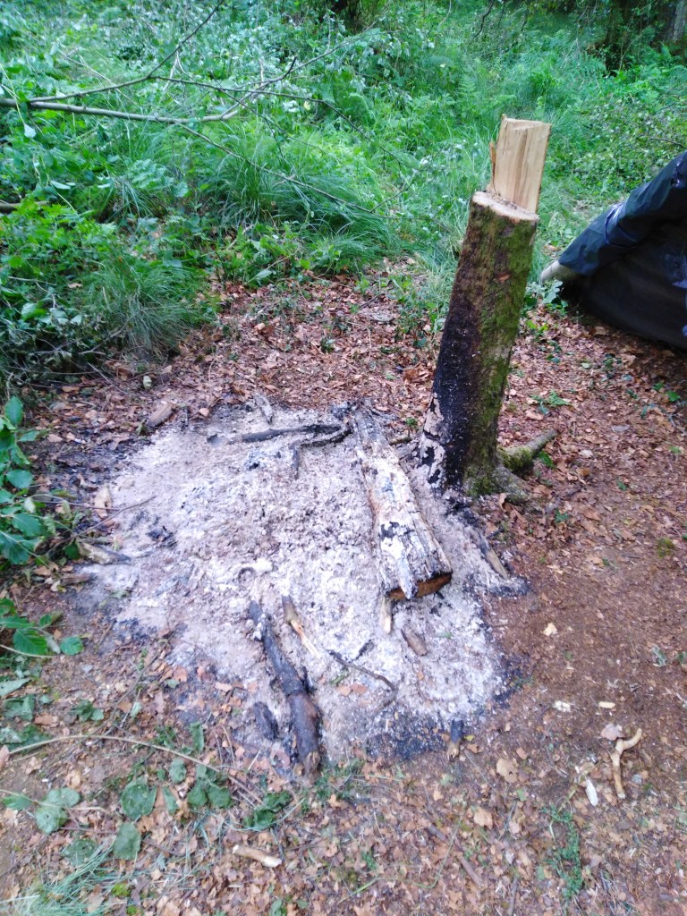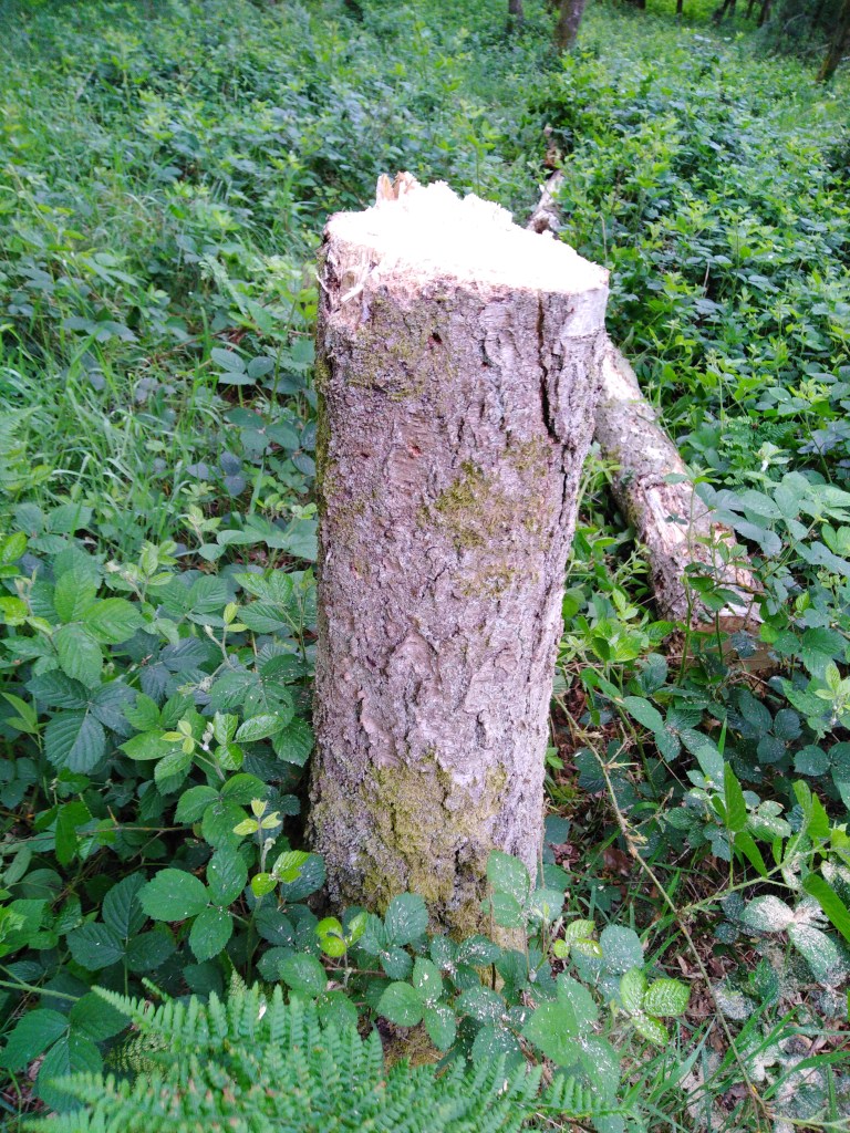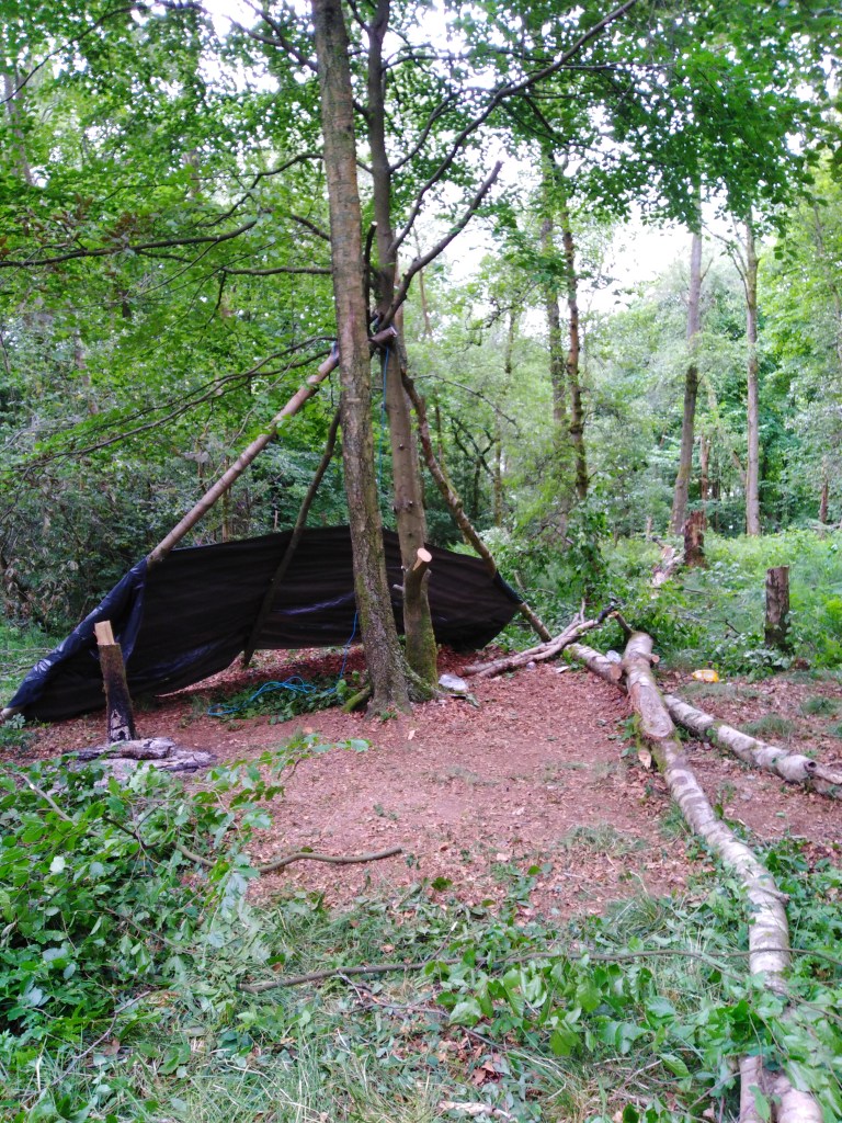 Now onto the disappointment. Yesterday I went up to my usual woodpecker watching spot and immediately was struck by the silence. Not a woodpecker cheep anywhere. I thought they must have fledged. Then I moved to a closer spot and saw a large black plastic structure – a den had been made very close by. I’m not against folk making dens in the wood, this was quite a well built structure but what sickened me was they had cut down at least three living trees to get the wood, rather than use the plentiful supply of deadwood available. A fire had been made and the place was littered with cans and wrappers. I wept.