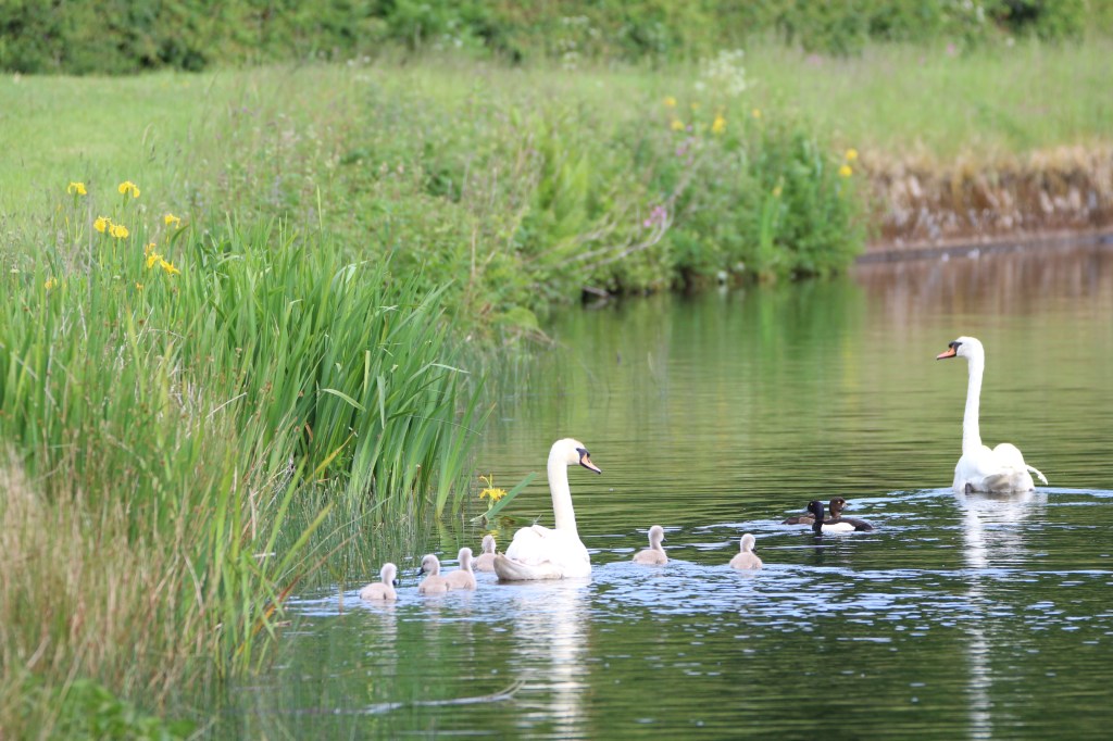 The swan family continues to thrive. Here they are joined by a pair of tufted ducks and with lovely yellow irises flowering along the bank.