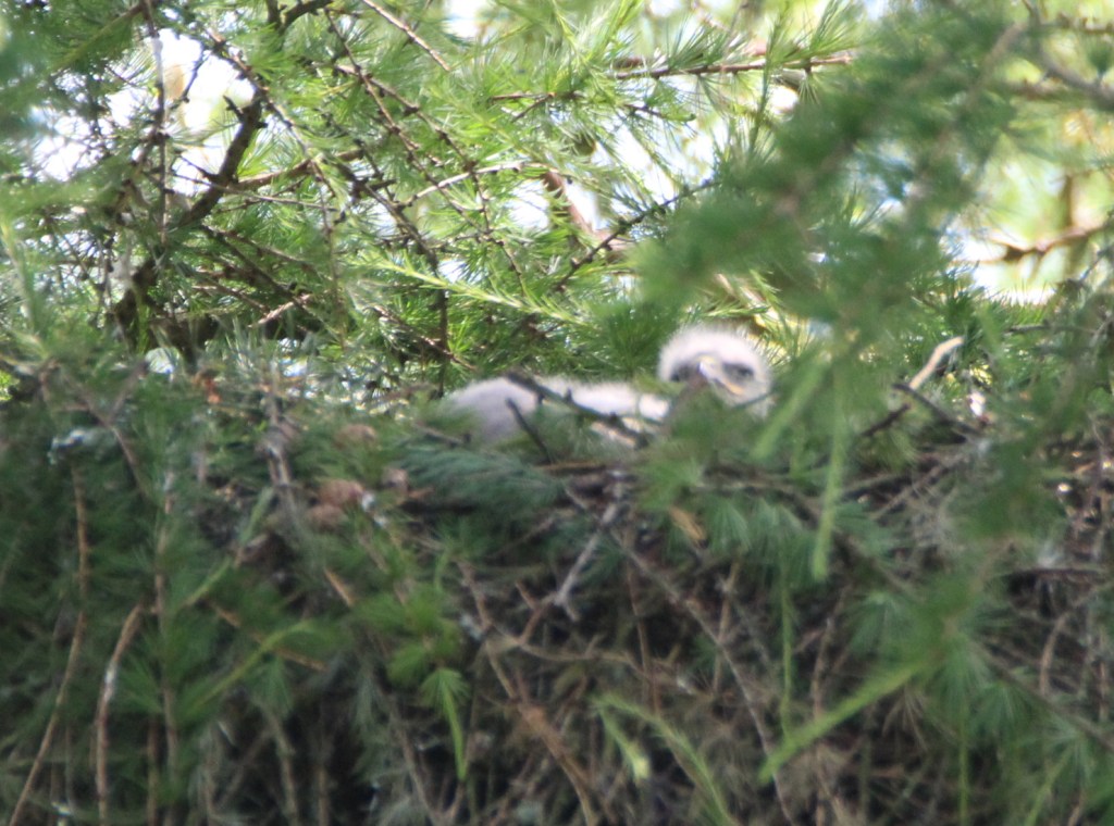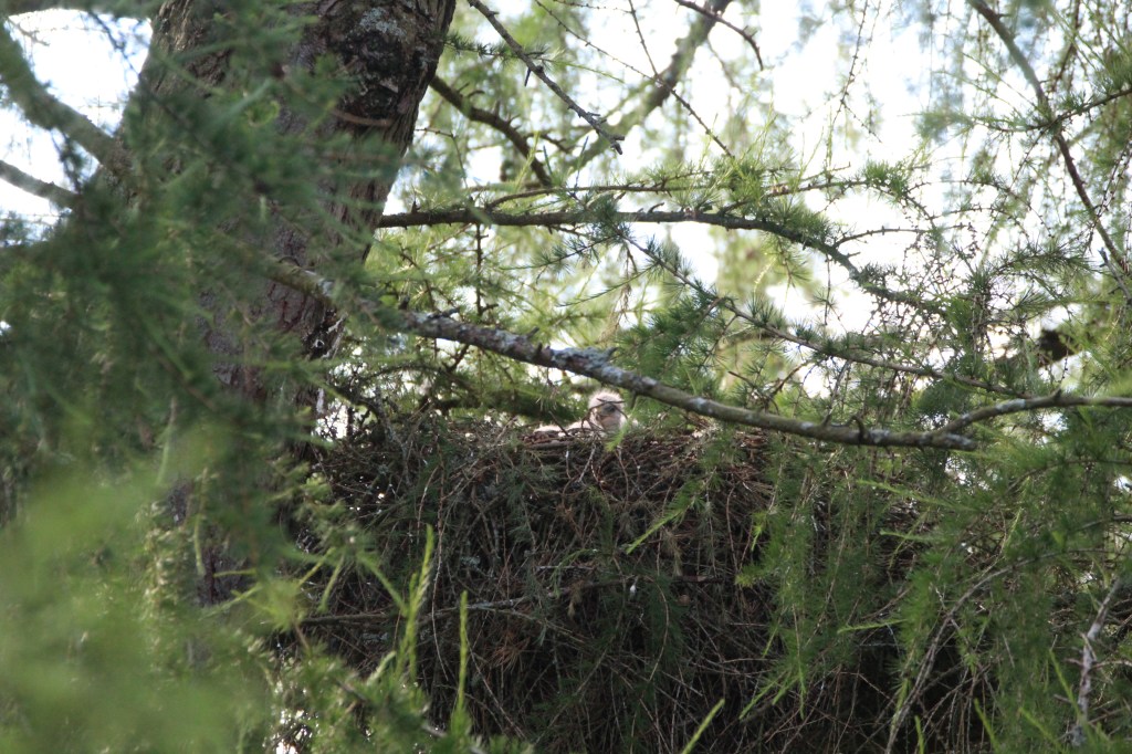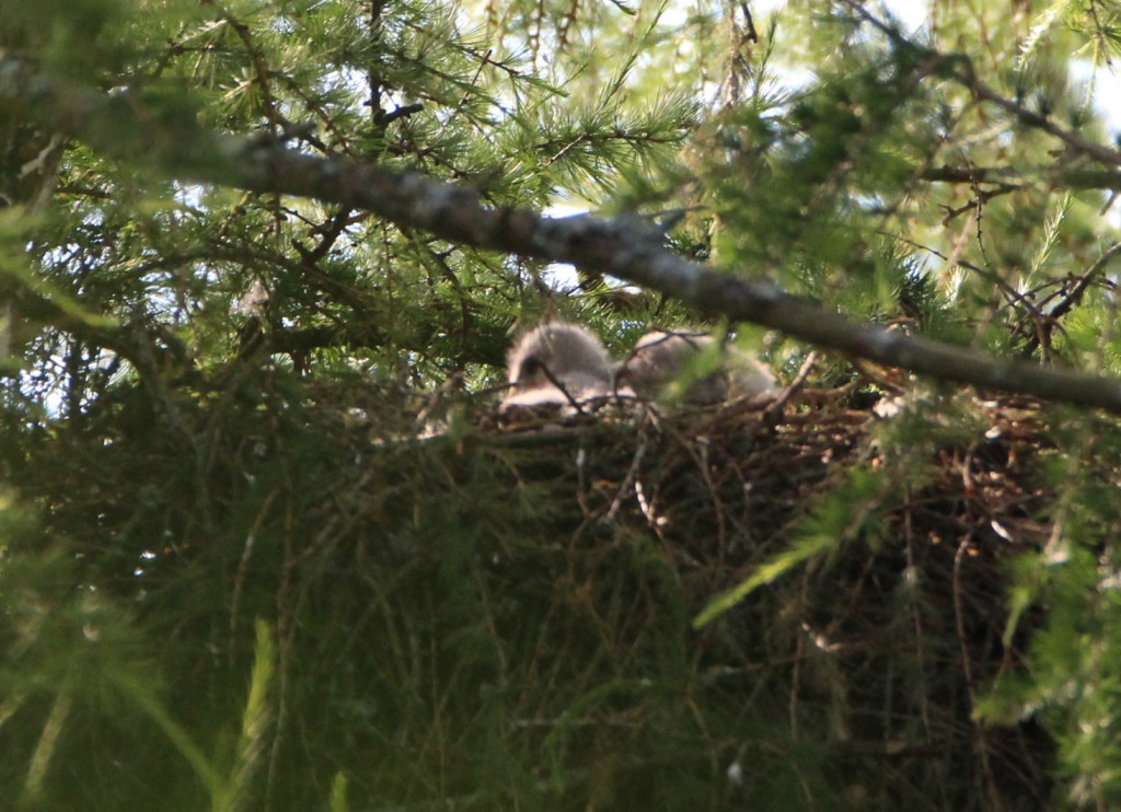 The other birds playing peek-a-boo with me this week are the buzzard chicks. They are still lying low in the nest but getting bigger, as I see when they stretch out their wings. I am not sure if the photo below is showing two chicks or one with its wing stretching a bit.