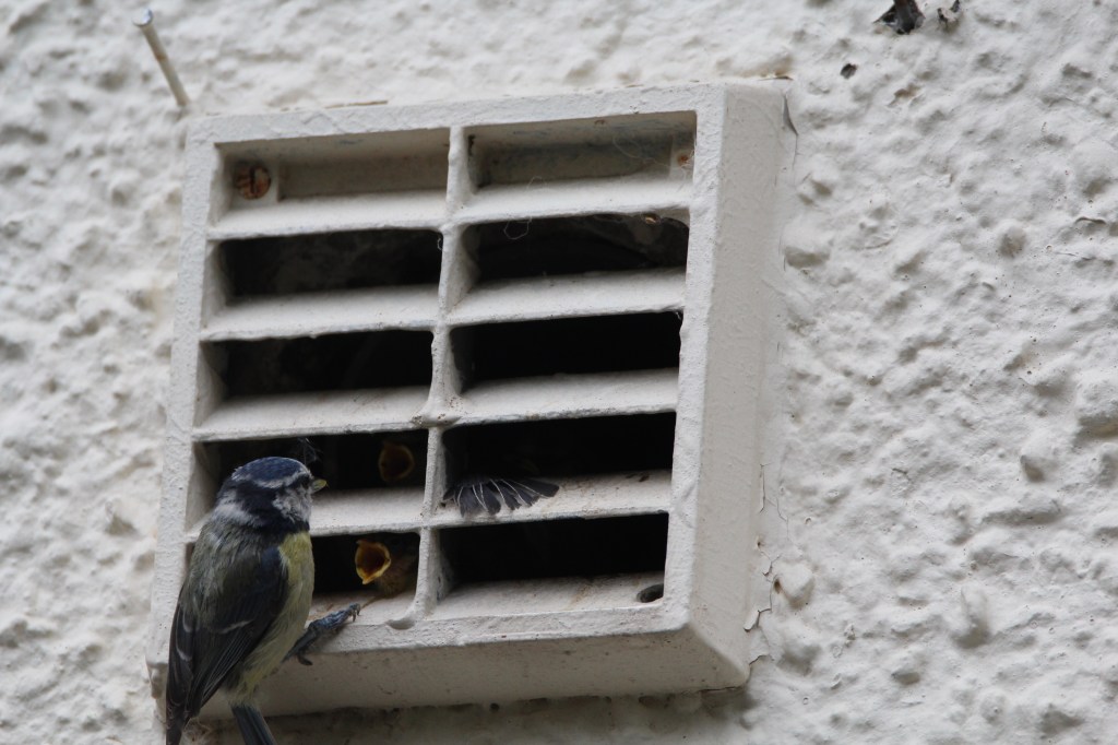 It’s not just the dipper chicks I’ve seen peeking out of nests this week. On a return visit to Dad’s back garden I saw the blue tit chicks, at least two of them, appear through the vent slits.