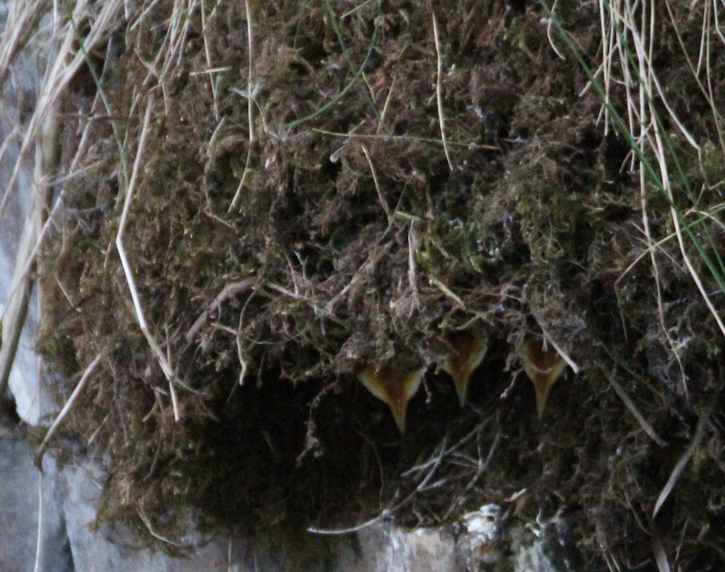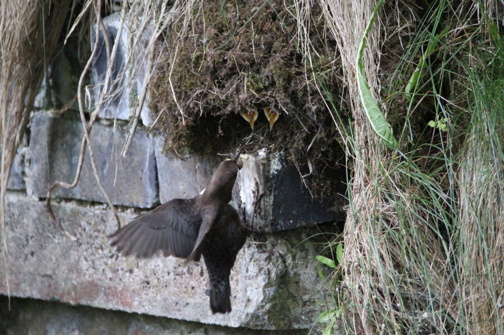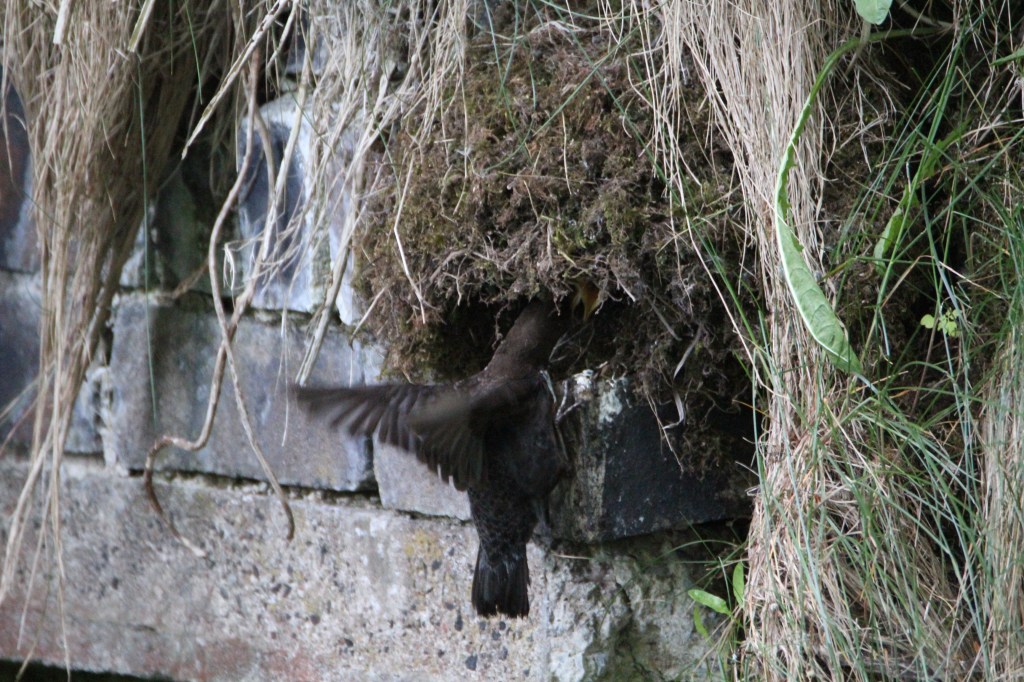 On Monday I discovered a dipper’s nest, not where I might have expected to see one. It is built into the arch of an old railway bridge over the river, not in the river bank itself. I read that dippers build nests out of moss onto rocky outcrops. There was a lot of activity from a pair of dippers around the bridge and I was thrilled to see them flying up to the nest to feed their chicks. I’ve been back today and can now see the gapes of the chicks themselves, at least three of them. They only appear and start squawking when a parent approaches the nest with food. Dippers collect food from the river bottom and will dip right under the water, even sometimes walk along the river bottom, to get tasty morsels. When perched on rocks they will bob their bodies up and down. I am not sure if they get their name from this action or from going beneath the water.