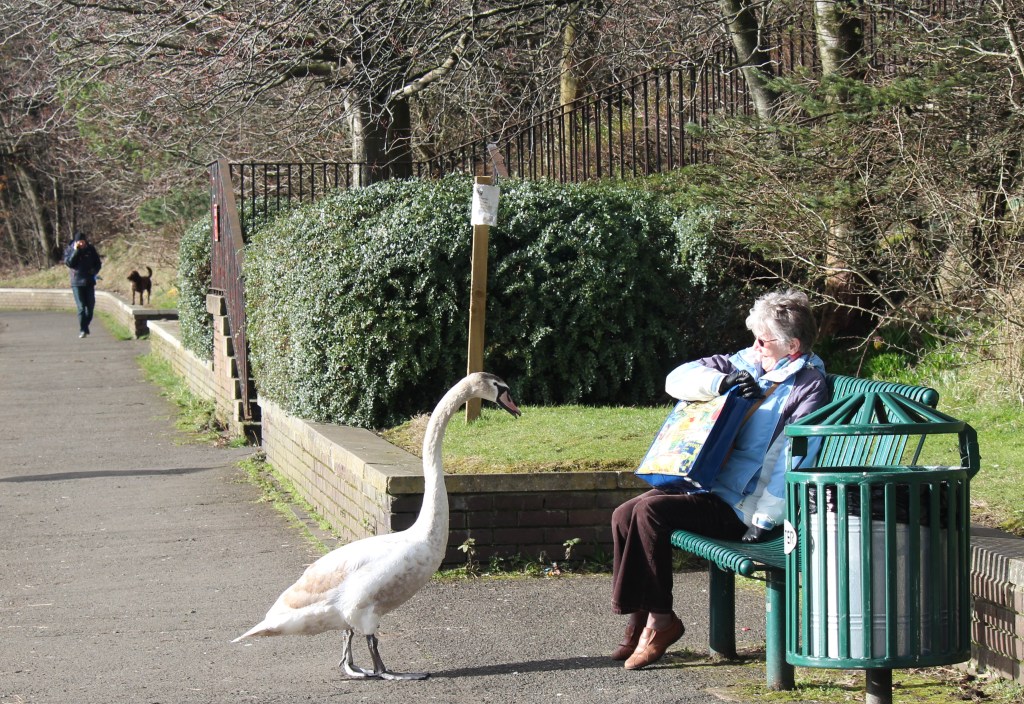 Finally a picture that shows that swans can sometimes be a bit intimidating. This swan is after some tasty snack hidden in the lady’s bag? It needs reminding of the 2 metre rule!
