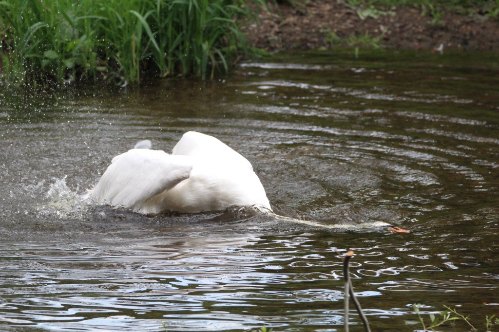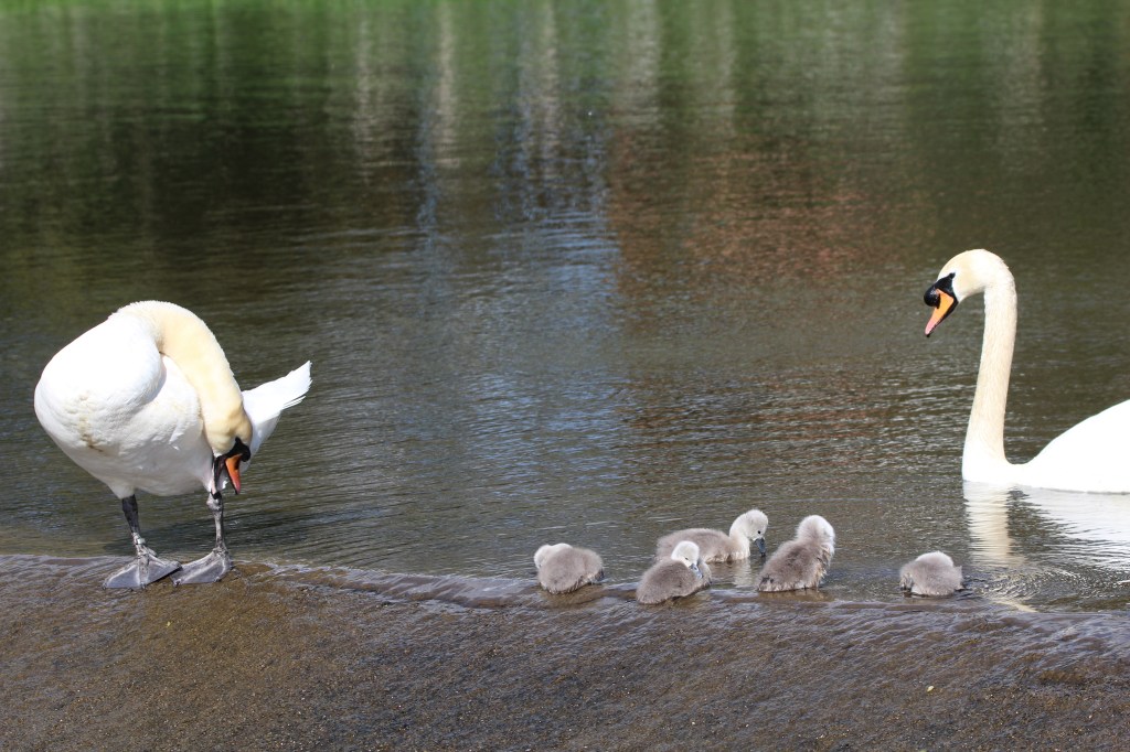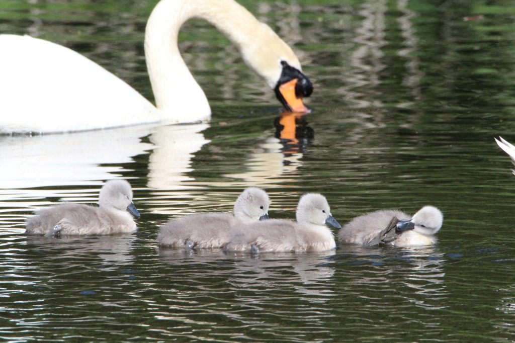 Here is a selection of photos of swans and cygnets from a variety of locations and times. Both pairs of local swans are doing well with their six cygnets each, and they have been going about exploring, feeding and preening. I was recently concerned when I couldn’t see any signs of the swan family anywhere on the pond, then I noticed they were out of the water and looking into the field at the side of the path. The grass is always greener on the other side of a fence!
