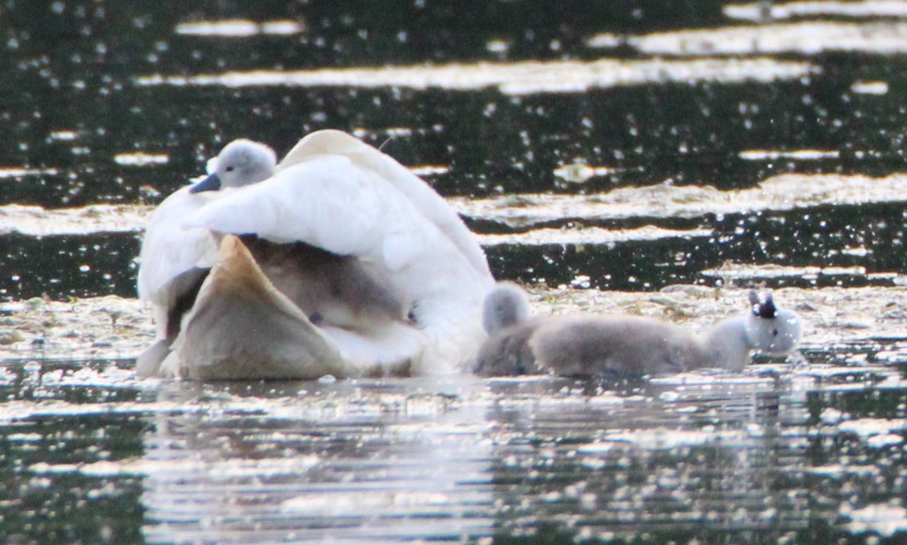 Some cygnets go for a ride in their parents’ backs, although I’ve not seen this this year. This photo was taken on the pond a few years ago.