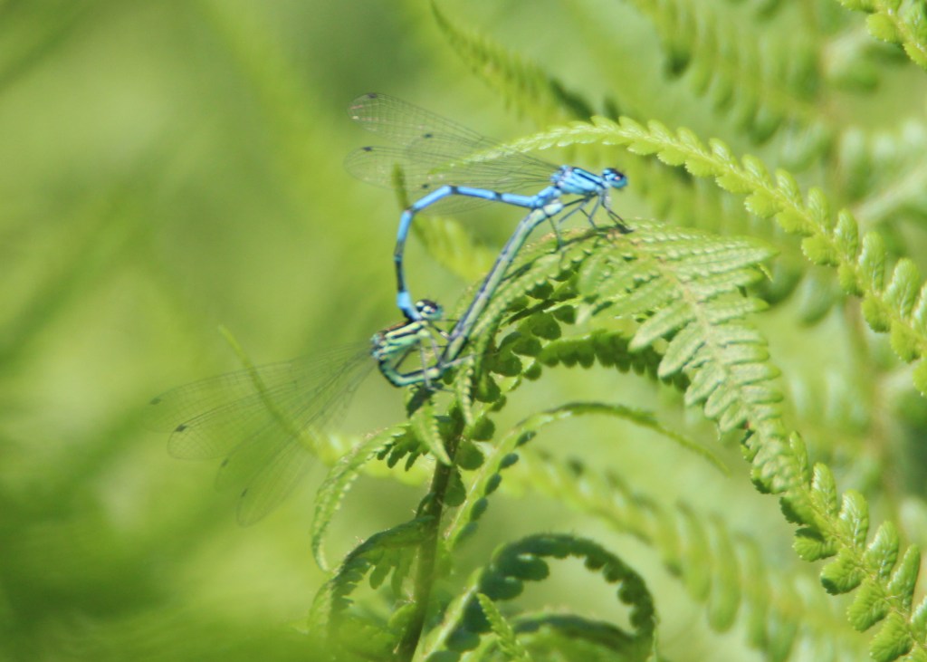 A few weeks ago there was an explosion of common blue damselflies around the ponds and meadows. They will have come from eggs laid in the water the year before which hatch into larvae which live underwater until fully grown. Once adults the larvae climb out of the water onto stems and shed their skins to become the beautiful fairy-like damselflies.