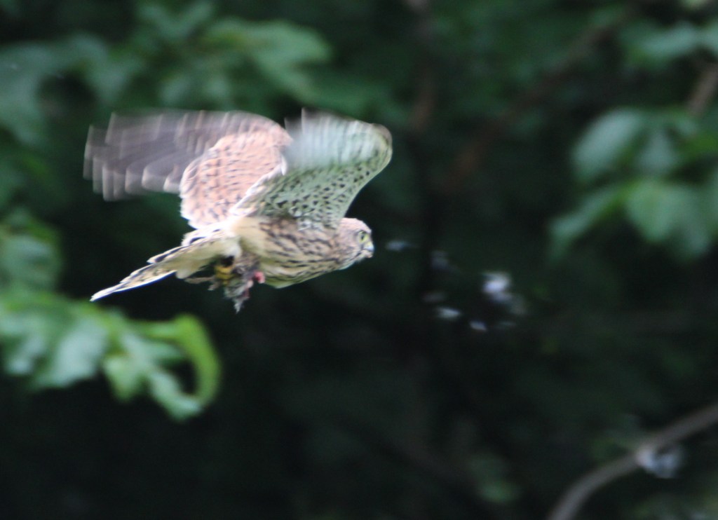 Off it flies, though not very confidently yet. Kestrels hunt from perches or by hovering in the air. This hovering action with the tail splayed is a good way to identify kestrels from other birds of prey.