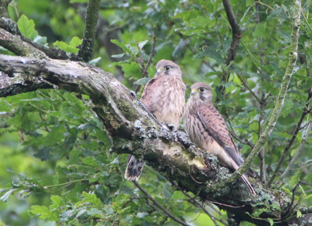 The kestrels I photographed in the tree hole last week have fledged! Here are two of the siblings sitting on a branch, waiting for their dinner. Their cries for food gave them away, although we had seen a kestrel flying over the field. As a parent approaches they cry out for food, and one seems much hungrier than the other.