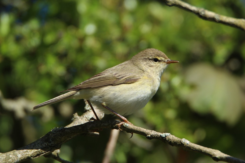 Other summer migrants are willow warblers and the chiff chaffs. They look very similar apart from having different coloured legs – a chiffchaff’s are black, a willow warbler’s more pinky brown. The chiffchaff is so called because that’s the sound it repeatedly makes.