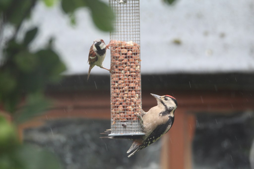 A month or so ago I was going up to the woodpeckers’ hole and watching young woody poking his head out and squealing for food. Now I have the pleasure of watching him feed from the nuts hanging in my garden. Sometimes its the dad that comes but I know this is one of the youngsters from the red patch on the top of its head. He’s sometimes having to share with this plucky house sparrow, although he’s learning to peck at rivals that get too close too.