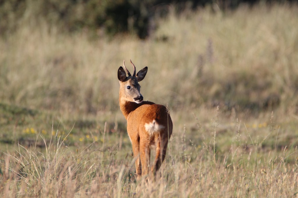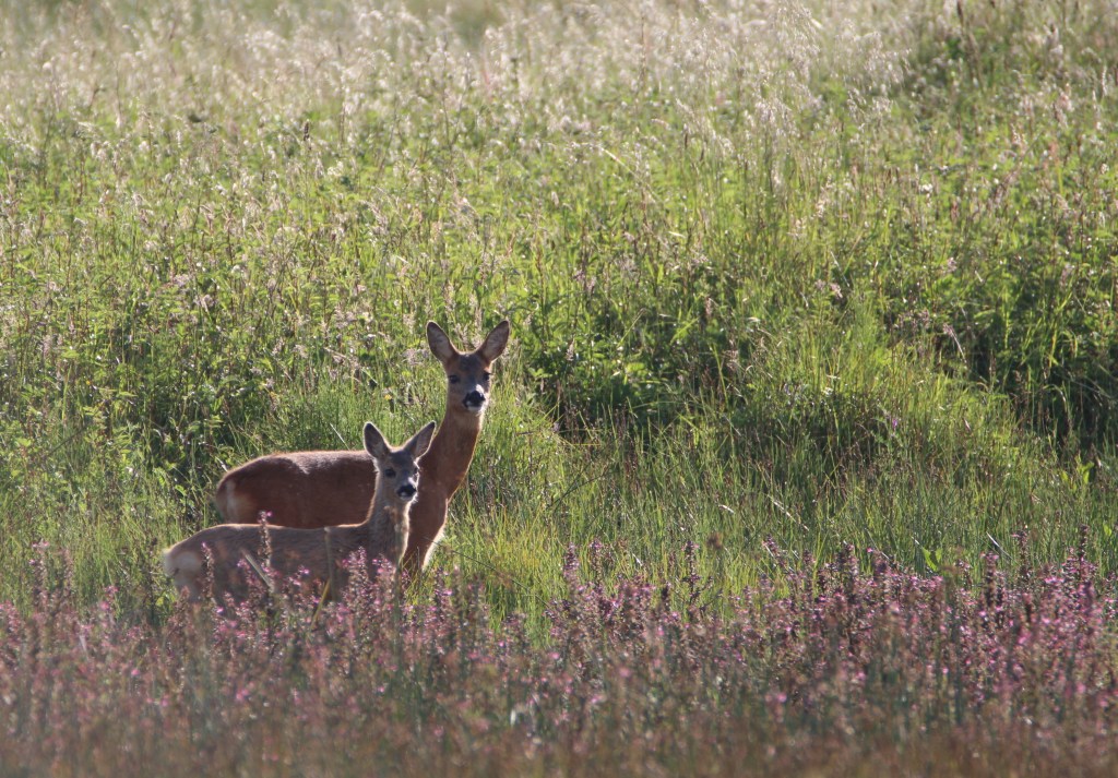 I saw lots of deer, some hiding in the long grasses, others in plain sight. This doe and fawn were on the other side of the wooden footbridge, foraging in the evening sunshine.