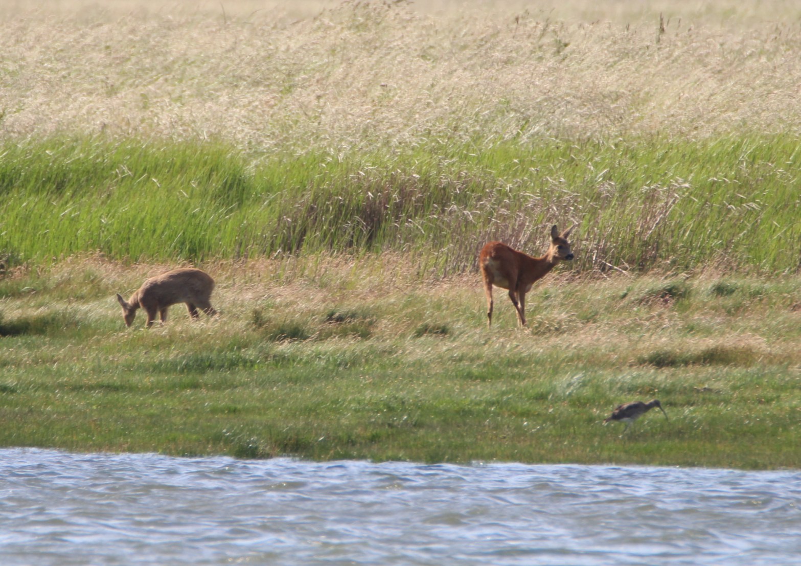I saw lots of deer, some hiding in the long grasses, others in plain sight. This doe and fawn were on the other side of the wooden footbridge, foraging in the evening sunshine.