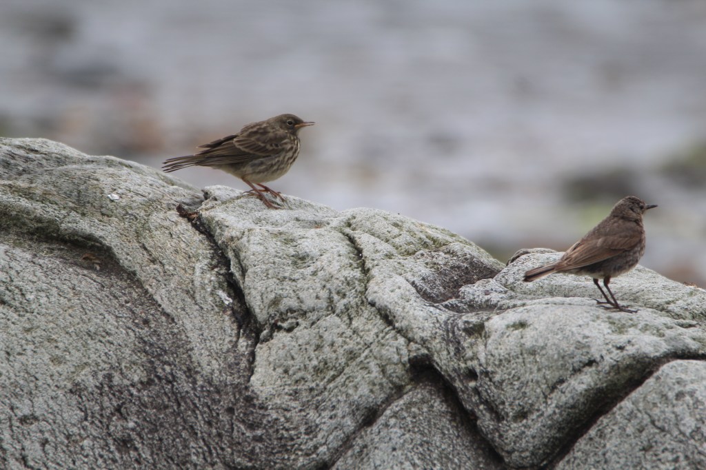 I think the wee birds below are rock pipits. There were a few of them flying on and off the rocks, I think one of them a juvenile.