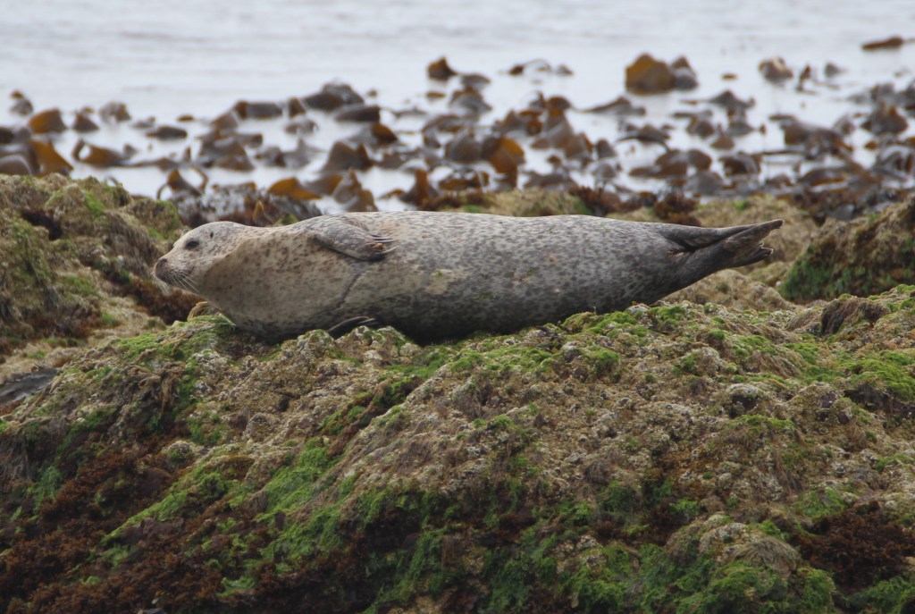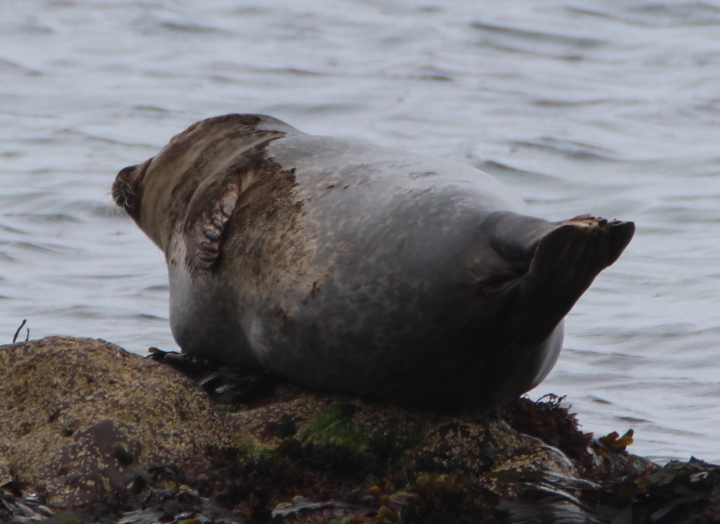 Seals love basking on rocks. They “haul out” of the water to rest and digest their food, as well as socialising together. There are two types of seal in Scotland, common seals and grey seals. I think these are common seals as they have more rounded heads and the eyes are close together and close to their noses. Also the young pups have brown coats and are born ready to swim. Grey seals have more flat and pointed heads and their pups are white. Grey seals also make more of a banana shape when lying on rocks. These common seals below are lying fairly flat along the rock.