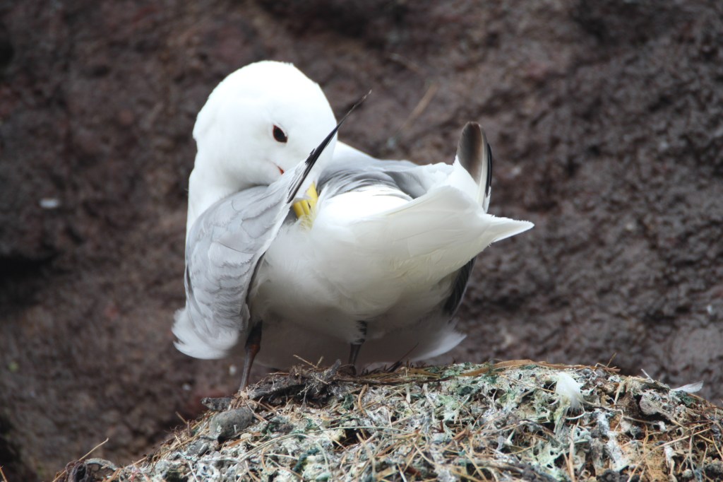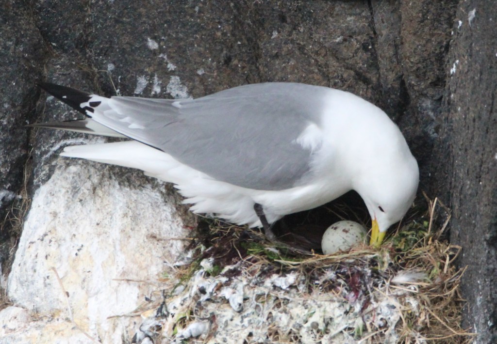 A kittiwake lays 2 to 3 eggs and a pair will take turns to brood them over 28 days. The photo below was taken on the Isle of May last year.