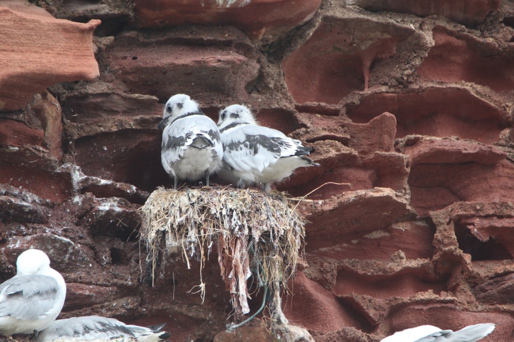 Once hatched the chicks are white, as there is no need for camouflage on cliff edges. However they need to keep pretty still on the nests for about 40 to 45 days as only when they can fly can they safely leave the nest.