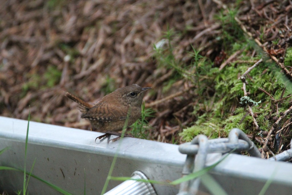Here a tiny wren was in its preferred position close to the ground. It had hopped up onto a chained up ladder, presumably the one normally used by rangers to climb up to the bird feeders.
