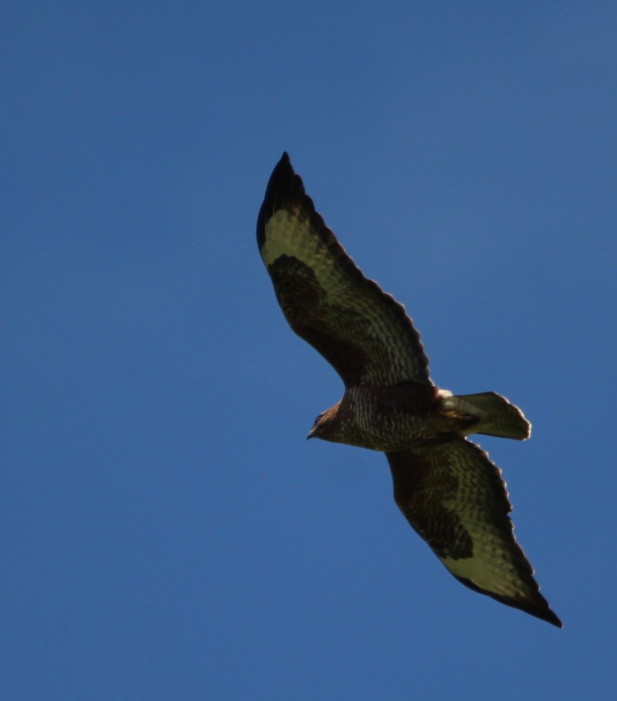 While I’ve been going into Buzzard Wood to watch the chicks the buzzard parents have been flying overhead, keeping a wee eye on me as well as hunting for dinner. They have beautiful patterning on the underside of their wings.