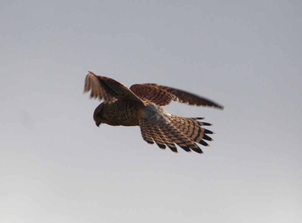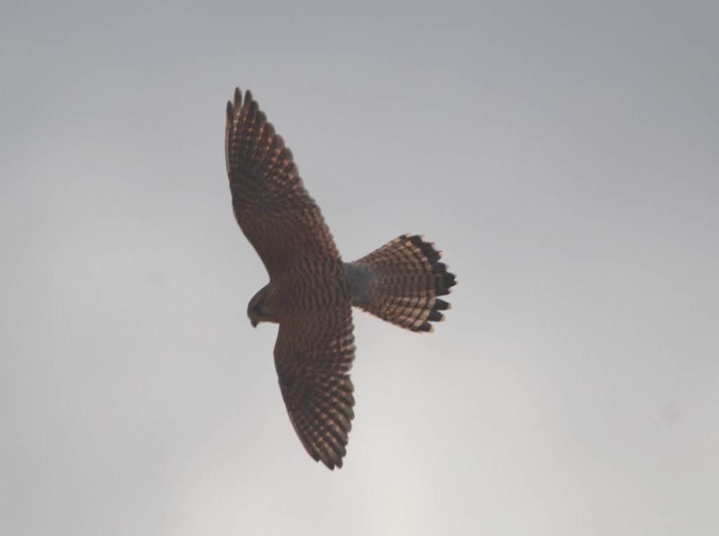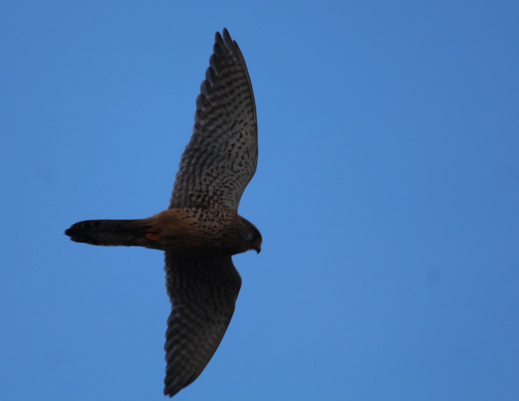 After a few minutes the kestrel flew away off. I lost sight of her for a while but then she came back overhead and I captured her from a different angle against a wintry patch of blue sky.
