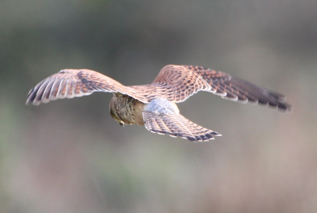 Of course just as I was trying to fine tune the focusing she turned her back on me! Female kestrels differ from the males in that they have browner wings and their tail feathers are barred. Also their heads are browner rather than the grey head of the males. The kestrel flew off the branch as I tried to approach round to the side of it, however it then swooped around and hung suspended in the air against a strong north easterly breeze.