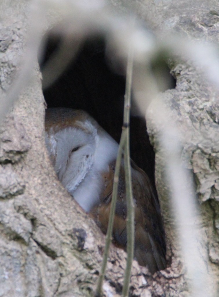 I have been doubly blessed this week by seeing two different kinds of owl and getting photos of them in the one week – and when I was not even looking for owls. That’s what I love about wandering in nature, you just never can tell what surprises you’ll see. I have dreamt of looking into a hollow of a tree and an owl looking back out at me and today it happened. A beautiful barn owl whom I accidentally disturbed as it roosted in a tree hollow. And this was when I was stalking a trio of hares playing in a field.