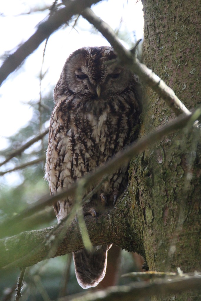 And here is the other owl I spotted this week. This is a beautiful tawny owl. I first spotted it when out a walk one rainy afternoon with my husband. I didn’t have my camera with me that time. But I went back to the same place two days later and after a very rainy, windy day and there it was again, sheltering on a favourite perch. I was careful not to disturb it.