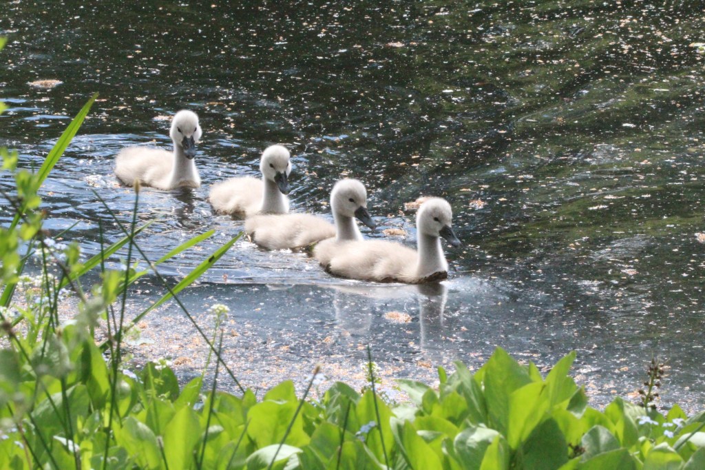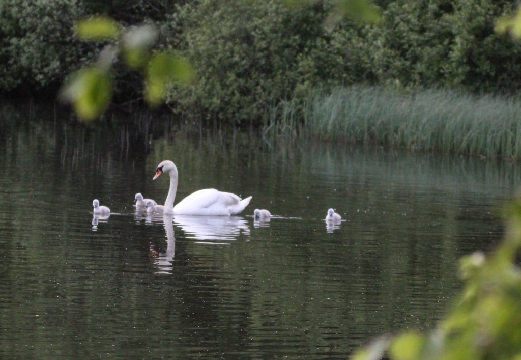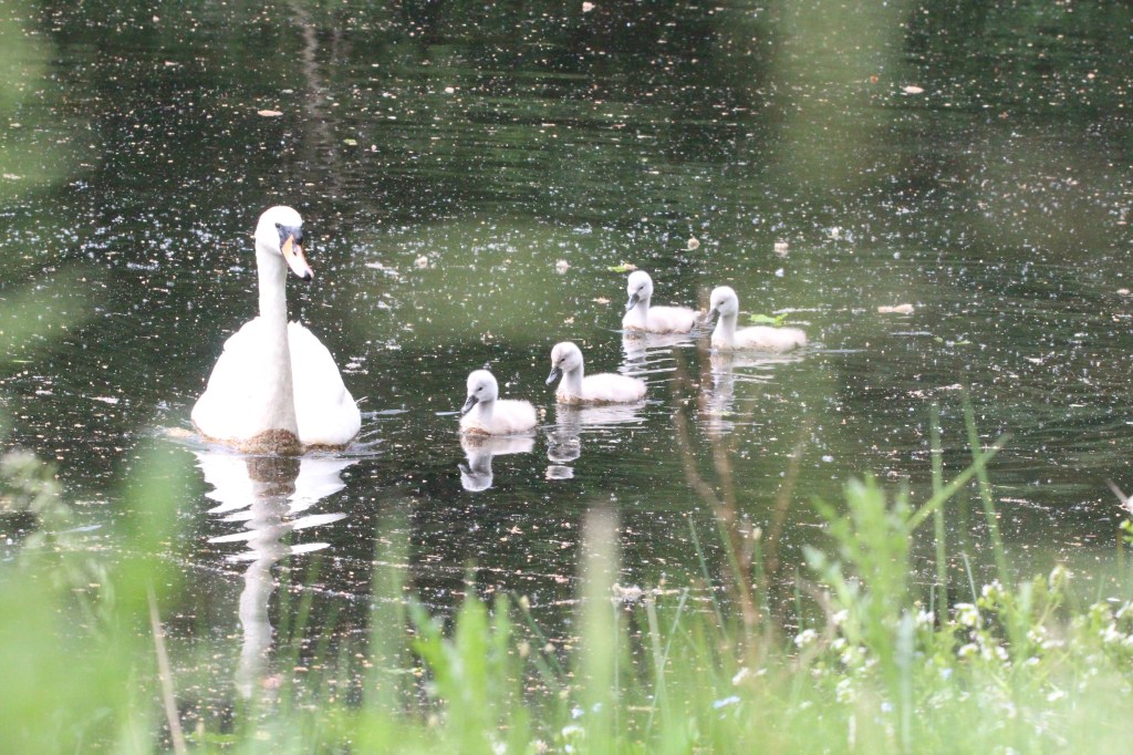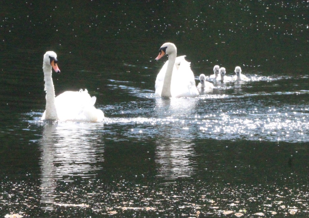 They are down to four cygnets. One year the pair lost all their cygnets so I wonder if moving them to the smaller pond gives them a better chance of survival. They are much more open to predation on the larger pond.