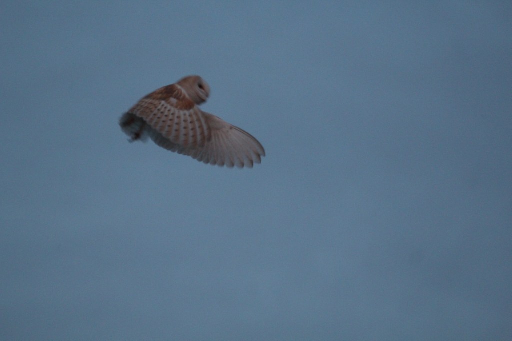 Fast forward two months after seeing the long eared owls at dusk and I finally managed to photograph “our” barn owls at dusk. This was after a few attempts. Barn owls have specially adapted feathers with a comb like edge which make them softer and silent in flight.