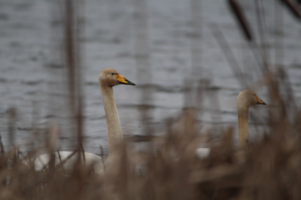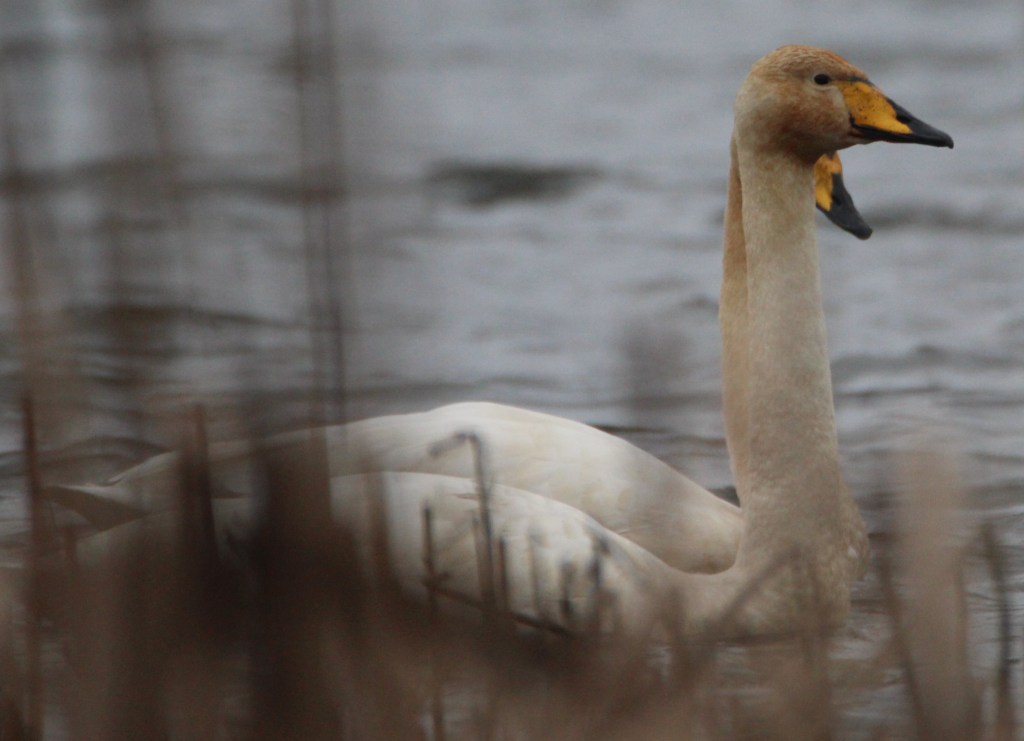 Here are a couple of whooper swans seen through a reed bed at a local marsh. They were part of a noisy group of thirteen. They look like they need a bit of a clean, just like my car at this time of year.