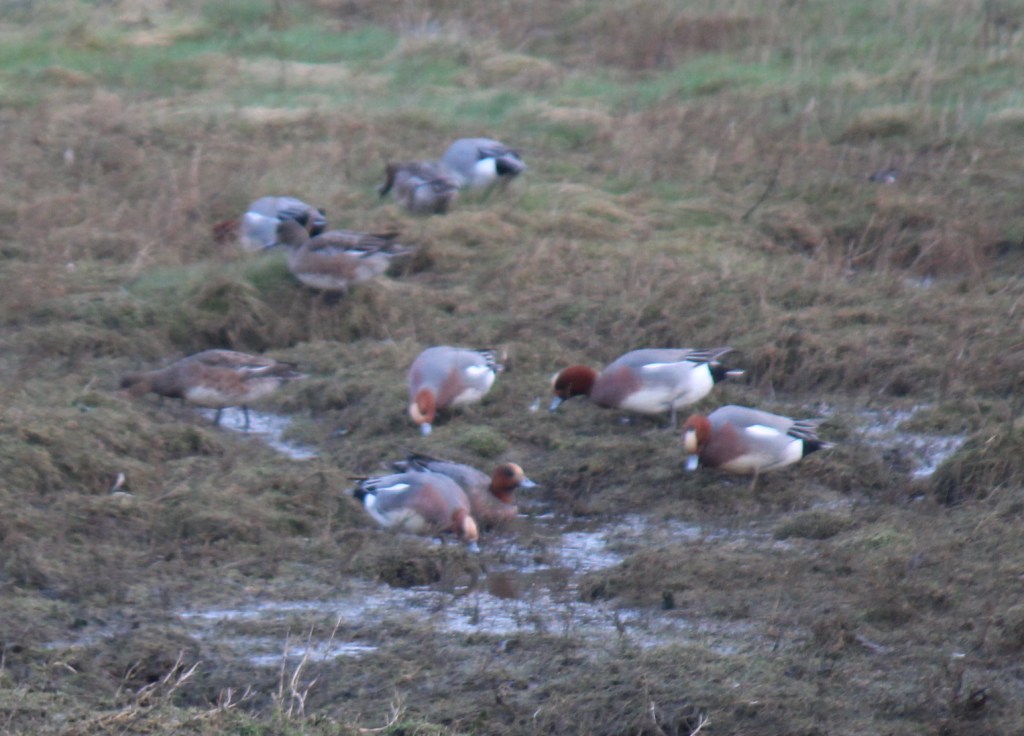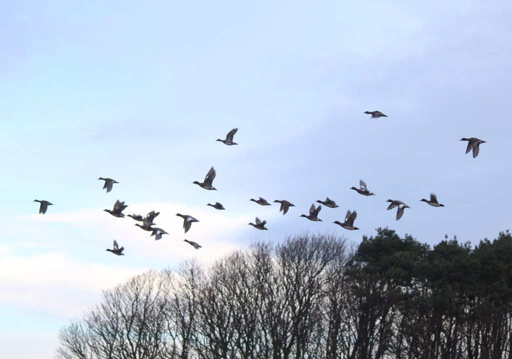 As well as whooping calls coming from the loch there were also some whistles sounding like rising and falling notes on kazoos. I’ve come to recognize these nasally whistles as being from wigeon, many also being winter visitors from Iceland, Scandinavia and Russia. Here is a photo of a group in flight.