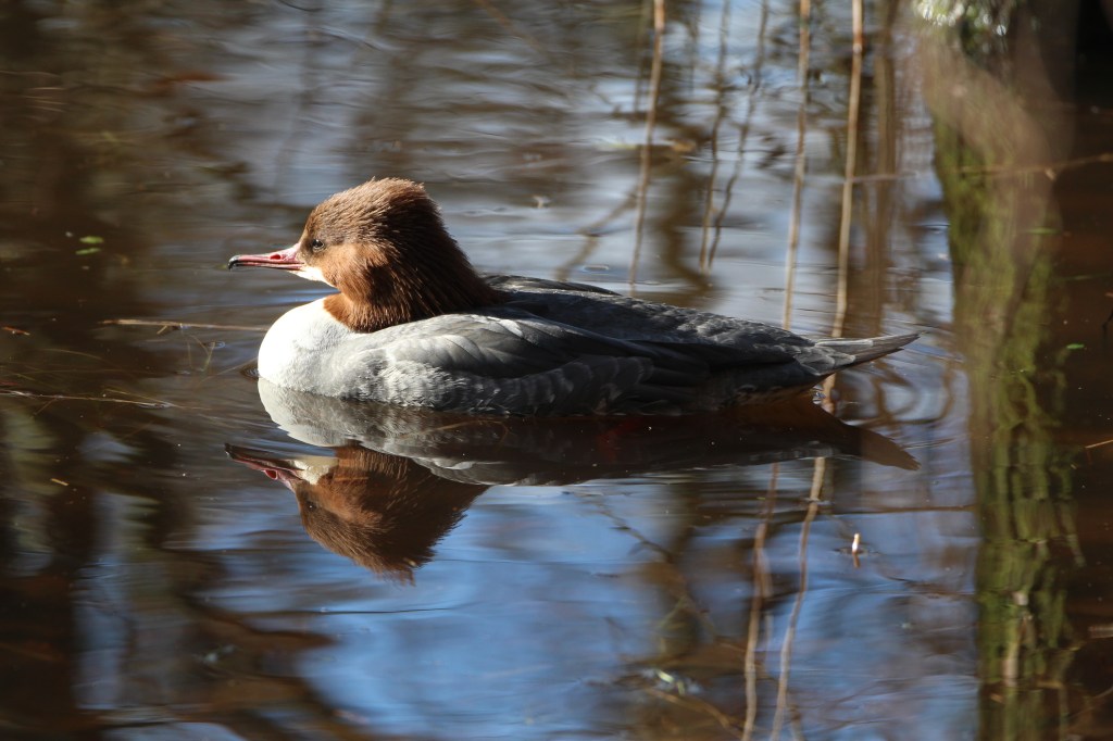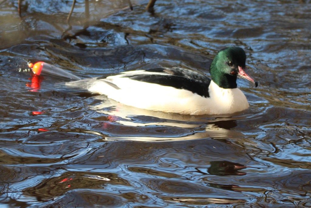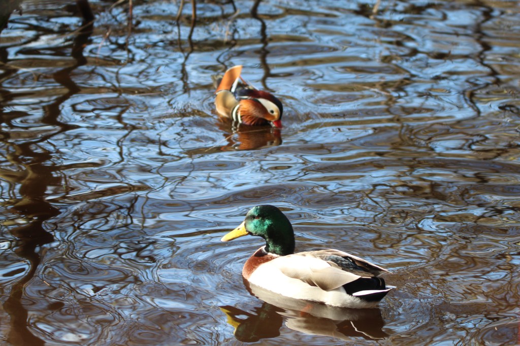 Next to the mandarin ducks was a pair of goosanders. The male has the dark emerald head and the female a brown crest. Sadly the male had a fishing float attached to its rear feathers. I hope someone is able to free it from this sometime, maybe a park ranger.