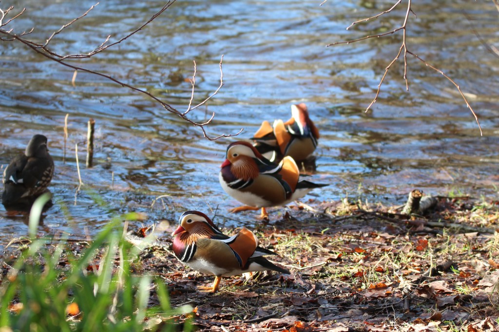 The ducks look quite surreal and very oriental. They were originally from the far East and are common in China, Japan, Korea and parts of Russia. However some were brought to Britain and have either escaped or been released into the wild. They seem to get along just fine amongst our native mallards and other species.