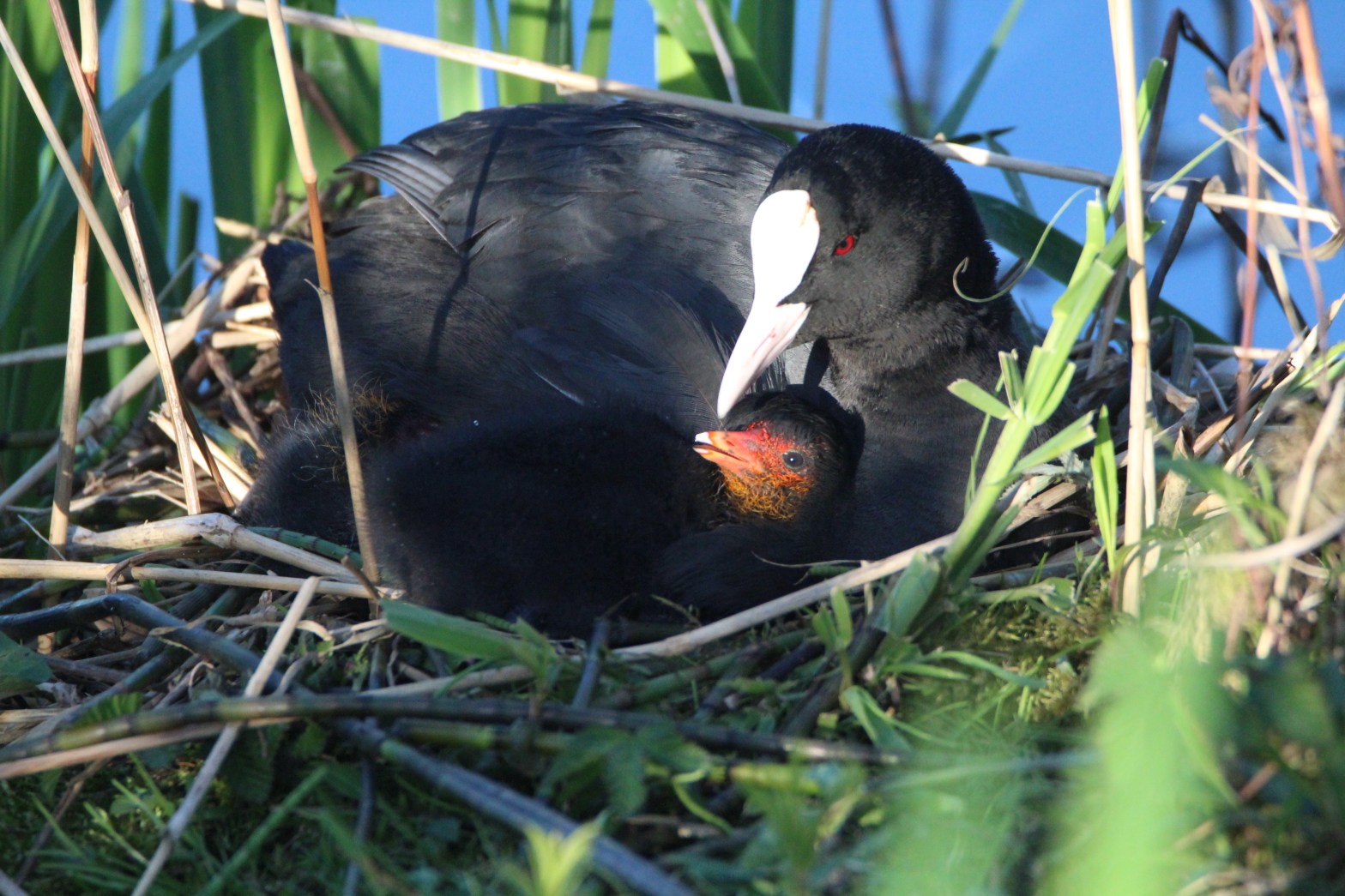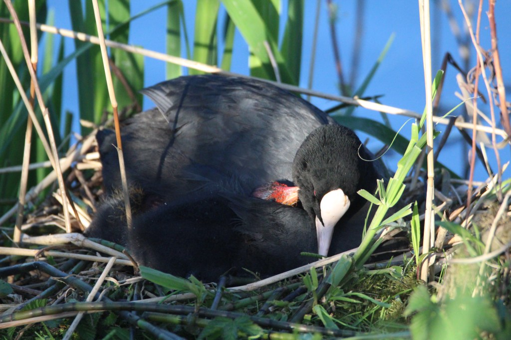 Yesterday evening we went to see how the coot chicks were doing and were treated to the sight of a couple of them snuggling in under their parent’s wings for warmth. The one in this photo was spotted on its own in the water heading back to the nest whilst being given toots of encouragement from its parent. There was already at least one other coot chick sheltering under the wings.