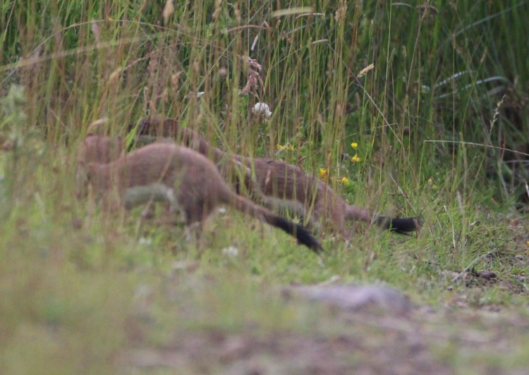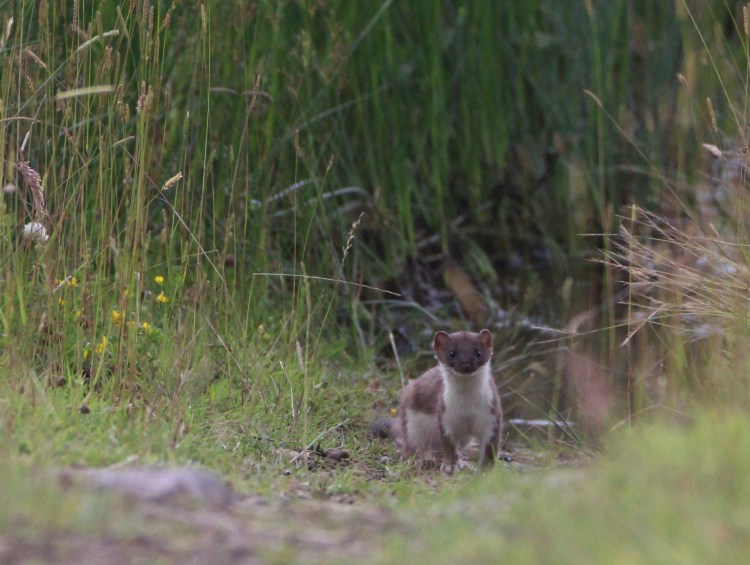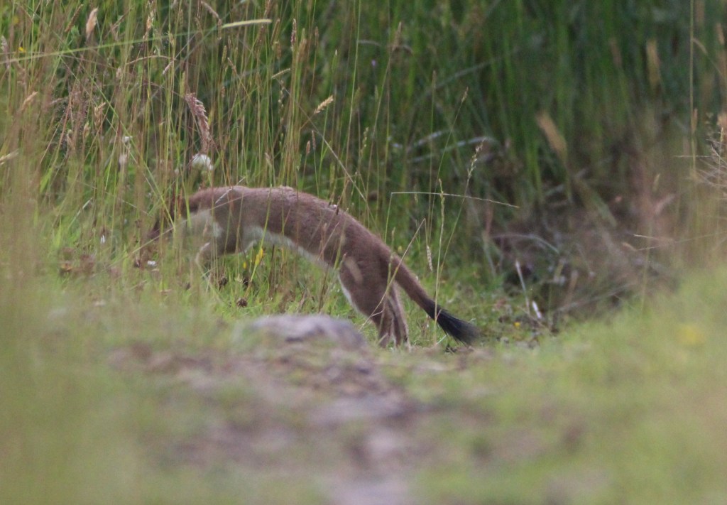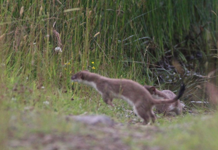 I’ve been trying a new technique with my camera called “back button focusing” and so today I went a walk up through fields to try and practise it on the hares I normally see there. But typically wildlife doesn’t appear to order -no hares were seen at all. So I put my heavy camera into my rucksack to carry. Then making my way along a seldom used quadbike track what should I see but a couple of stoats cavorting in front of me!