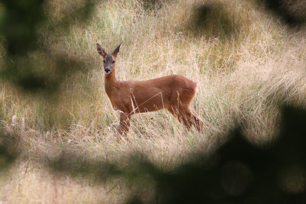 Sometimes there’s a scarcity of wildlife to see in the summer, especially in the afternoons when I think the birds take a siesta and stay hidden in foliage. However you can usually depend on deer to appear somewhere on a walk. Sometimes they can be spotted at the edges of fields, grazing the wild flowers. Keep downwind of them and they are less likely to detect your scent and run away.