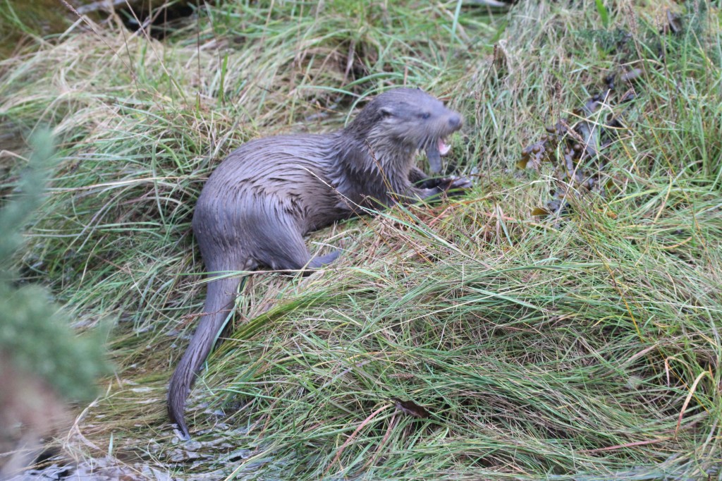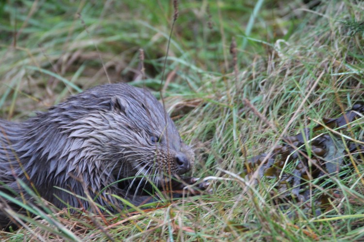I snapped away, delighted to see them until they disappeared out of sight. Then I heard some unfamiliar “keek, keek” sounds coming from behind me. So I walked up beside the burn running into the sea and couldn’t believe my eyes! There was one of the otters perched on a grassy tussock in the middle of the stream munching away on a fish!