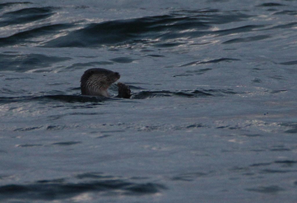 The otters were in and out of the sea, chasing and cavorting with each other. Such a lovely sight to see mid afternoon. The tide was coming in quite rapidly and all too soon the rocks and the otters disappeared out of sight into the sea. What a thrill to see such a lot of these wonderful creatures. I doubt I’ll ever have another two days in a row of otterly magical sightings again.