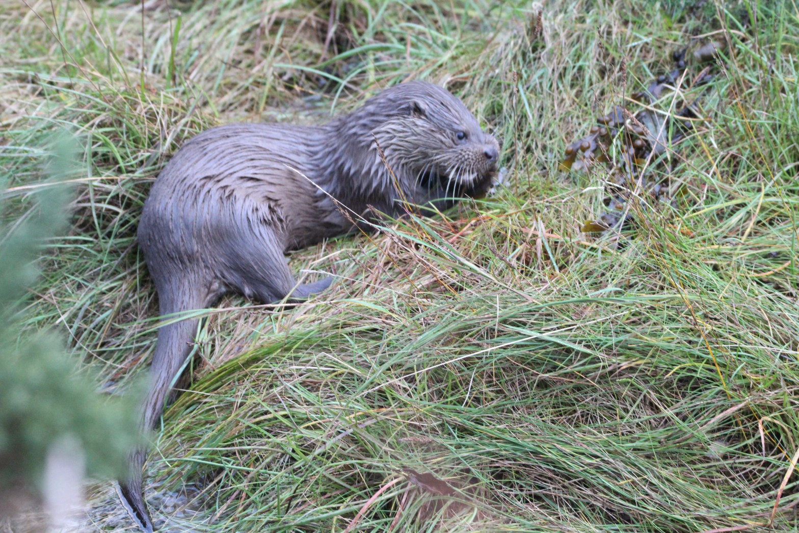 I snapped away, delighted to see them until they disappeared out of sight. Then I heard some unfamiliar “keek, keek” sounds coming from behind me. So I walked up beside the burn running into the sea and couldn’t believe my eyes! There was one of the otters perched on a grassy tussock in the middle of the stream munching away on a fish!
