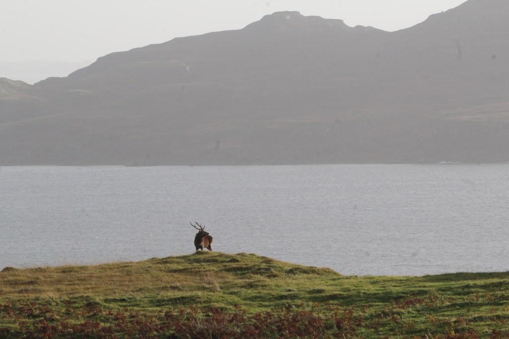 On our recent trip to Mull we heard a lot of plaintive moaning and loud bellowing coming from the bracken covered hillsides. This was the sound of red deer stags announcing and defending their territory. The rutting season had begun with stags rounding up their harem of female deer, known as hinds. to mate with. Other stags would try and break up the harem and snatch some hinds for themselves, sometimes having to do battle for them and literally “locking horns”.