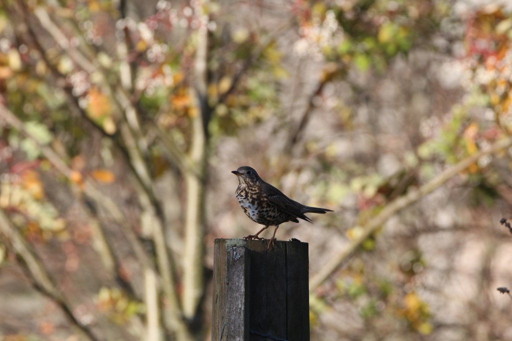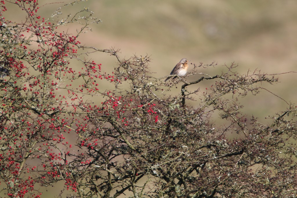 Fieldfares and redwings are back foraging for berries. As many as 600,000 migrate to the UK from Scandinavia and Northern Europe in autumn time. They are quite shy and fly off as soon as they hear you approaching. They make a repeating “chack chack”sounding call. I think this solitary one at the top of a bush is a fieldfare. Redwings have more distinct red patches underneath their wings.